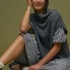 - Falls 47.5″ from shoulder to hem